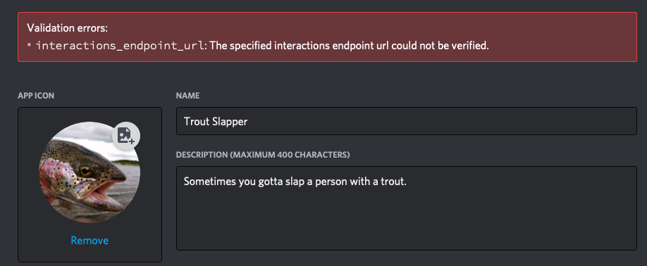 If we start our server and try to connect our application to Discord at this point, we'll get a failure message. It turns out that our application can't accept every request that it is sent - we need to do some verification work to ensure the request is valid.