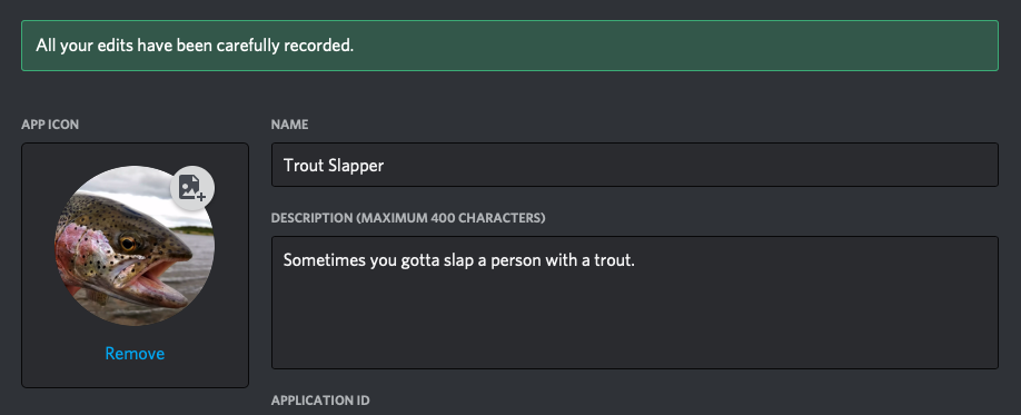 For our slap message, we want it to display as {user} slaps {target} around a bit with a large trout. Discord messages use simplified Markdown formatting, with special sequences you can use to mention different things - to get this display, we'll format our message like this: