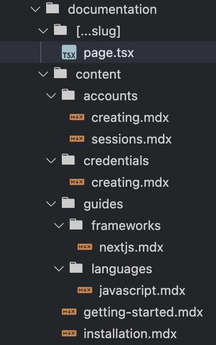 First, let’s create a the Next.js page by making a /documentation/[...slug]/page.tsx file. This will match any routes under /documentation - they could be nested, so we’ll need to accept an array of strings as the parameter type.